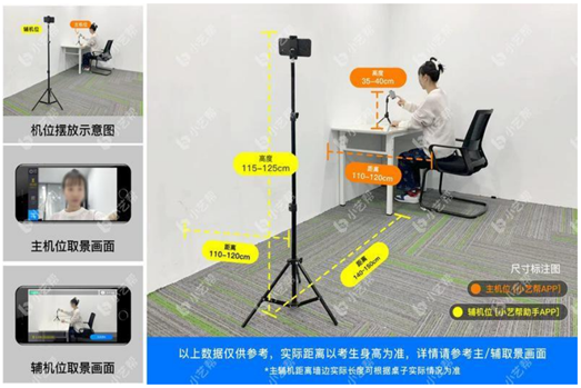 1.考试终端为两部智能手机,考生仅可使用两部手机完成考试。手机 A(安装“小艺帮”APP)作为主机,用于实时考试作答,横屏摆放;手机 B(安装“小艺帮助手”APP)作为辅机,用于考试实时直播监考,横屏摆放。