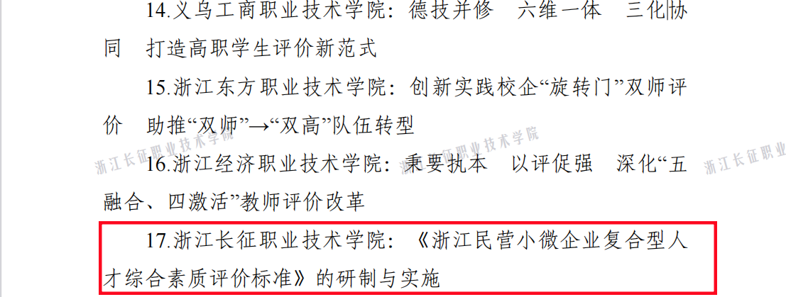 近日,浙江省第四批教育评价改革典型案例评选结果公布,学校报送的案例“《浙江民营小微企业复合型人才综合素质评价标准》的研制与实施”成功入选。这是学校推动教育评价改革试点项目建设以来取得的又一项标志性成果。