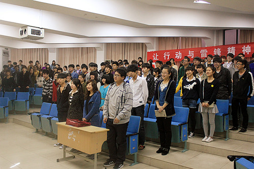 影片结束之后,由学院团委秘书处吴樑同学带领大家宣誓,“向雷锋同志学习,发扬公仆精神,发扬钉子精神,传承雷锋精神,争做四好少年,投身社会主义,共创和谐社会。”